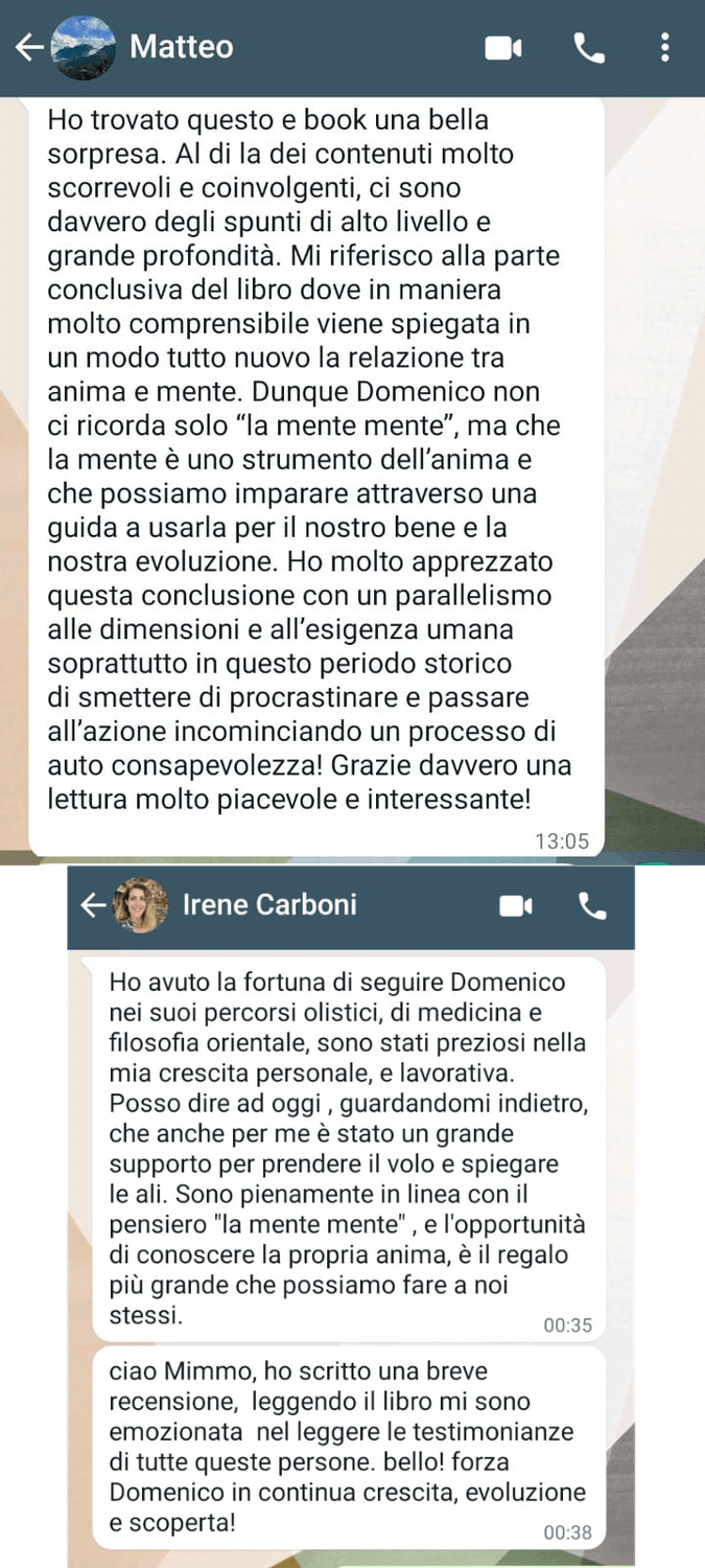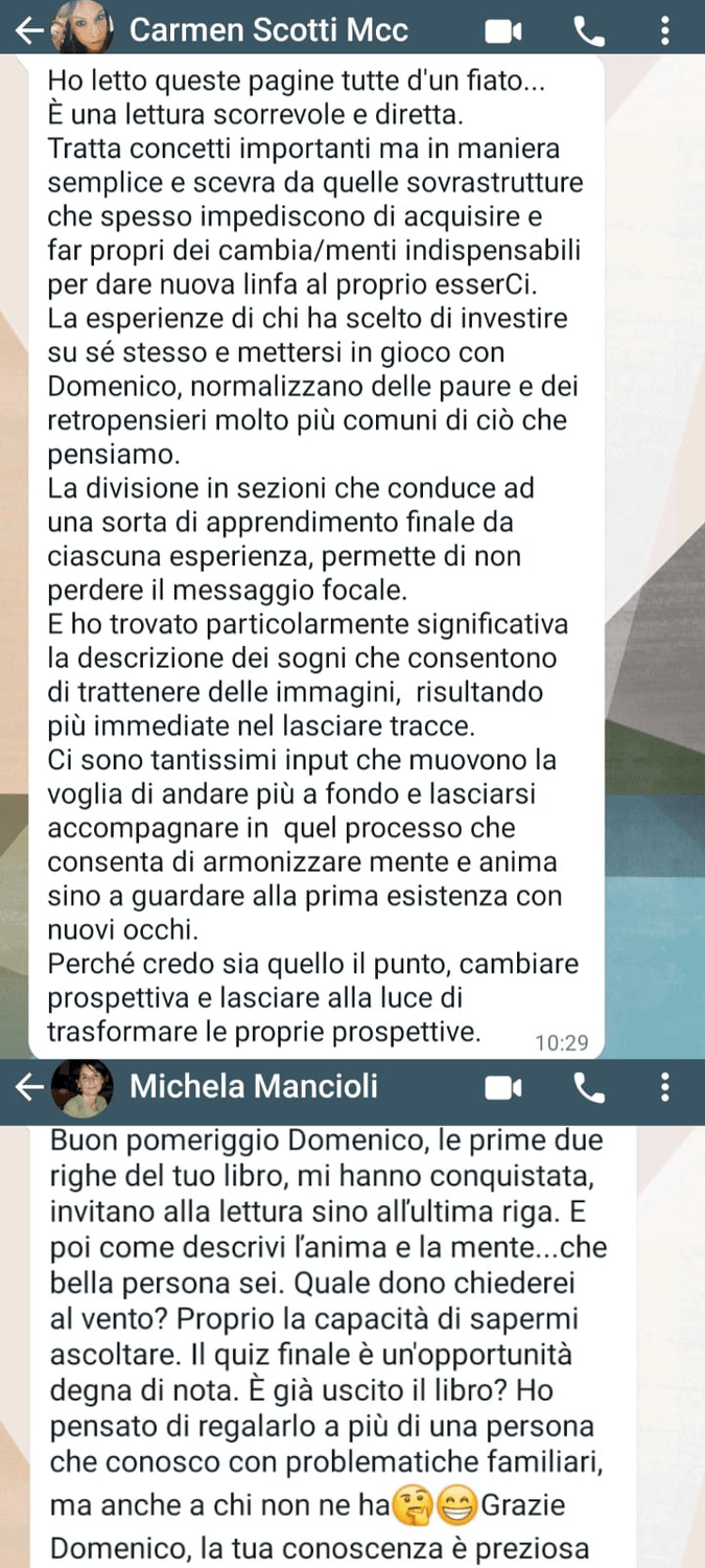 'Sono grato a Domenico perchè ora sono più calmo e riesco a vedere le cose diversamente. Prima ero succube delle mie emozioni e ansie. Mi sento più consapevole e ho migliorato la mia comunicazione nelle relazioni con gli altri e anche a lavoro.