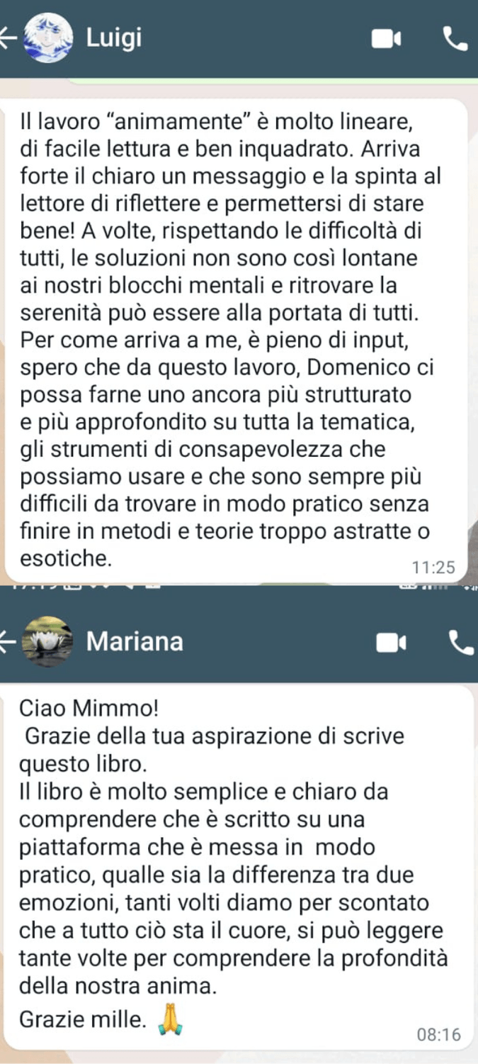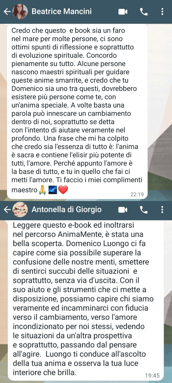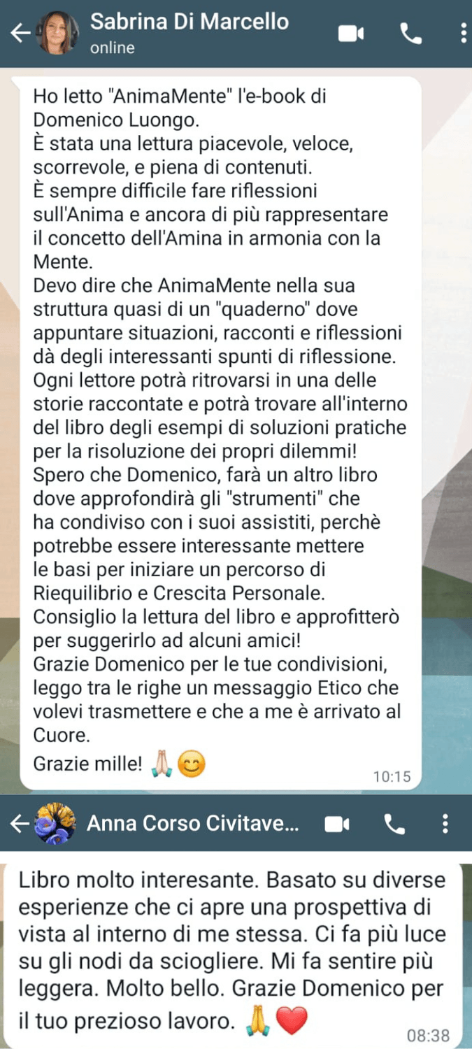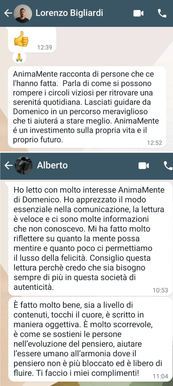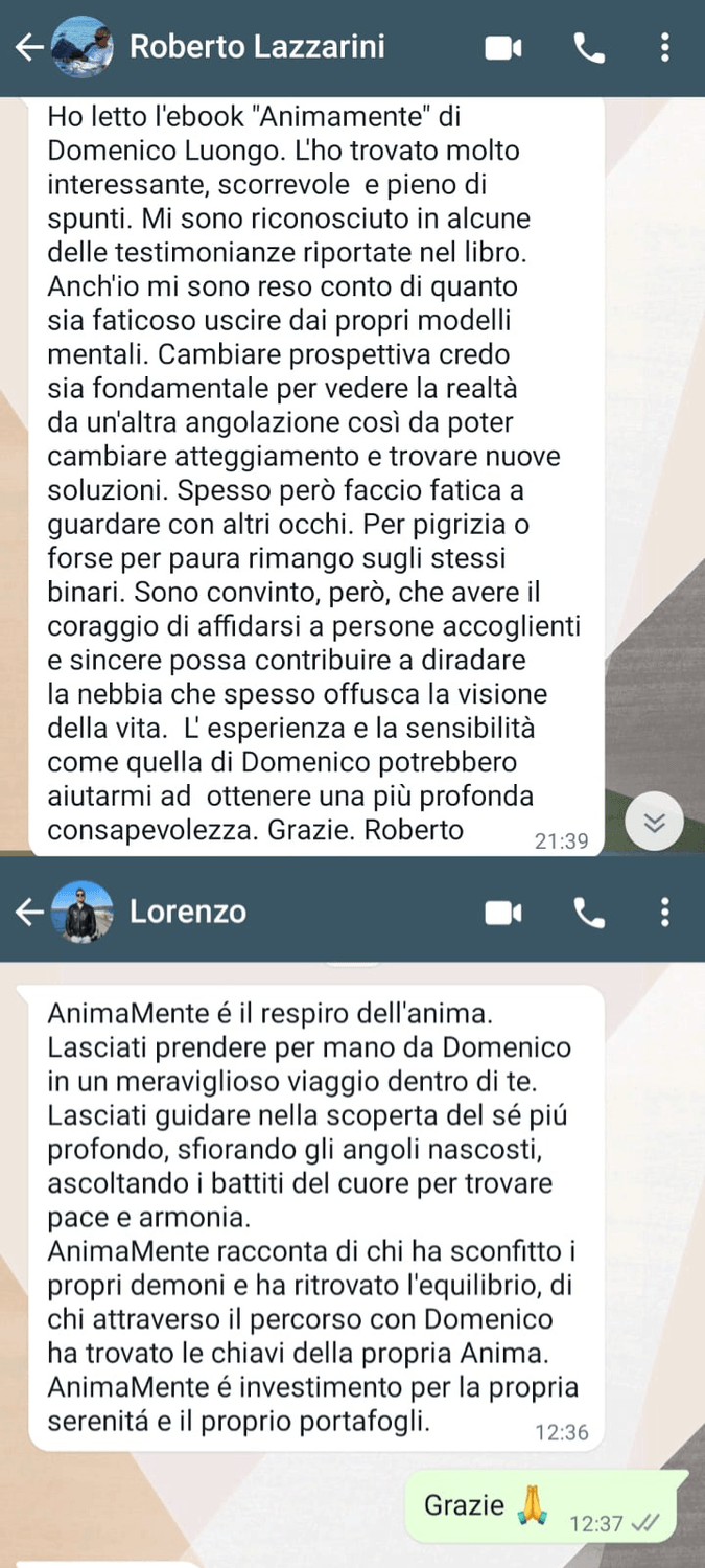 "Ho finalmente raggiunto una pace interiore che mi mancava da anni. Ho imparato a gestire le mie dipendenze emotive, a trovare equilibrio nella mia vita spirituale, familiare e professionale. Ora mi sento completo e pieno di serenità. Sento di aver ritrovato me stesso e ho aperto la porta a una vita piena di felicità e realizzazione anche a lavoro! Sto seguendo l'accademia "AnimaMente" con passione. Ritengo che ne possano trovare giovamento tutti, per questo lo consiglio a tutti!"