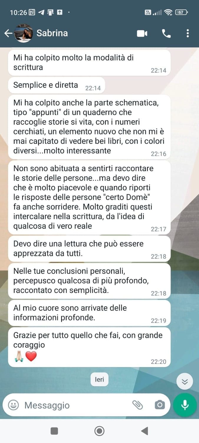 Poi ho continuato perchè parlando con Domenico ho riflettuto su di me, ciò mi ha aiutato nella mia crescita interiore.