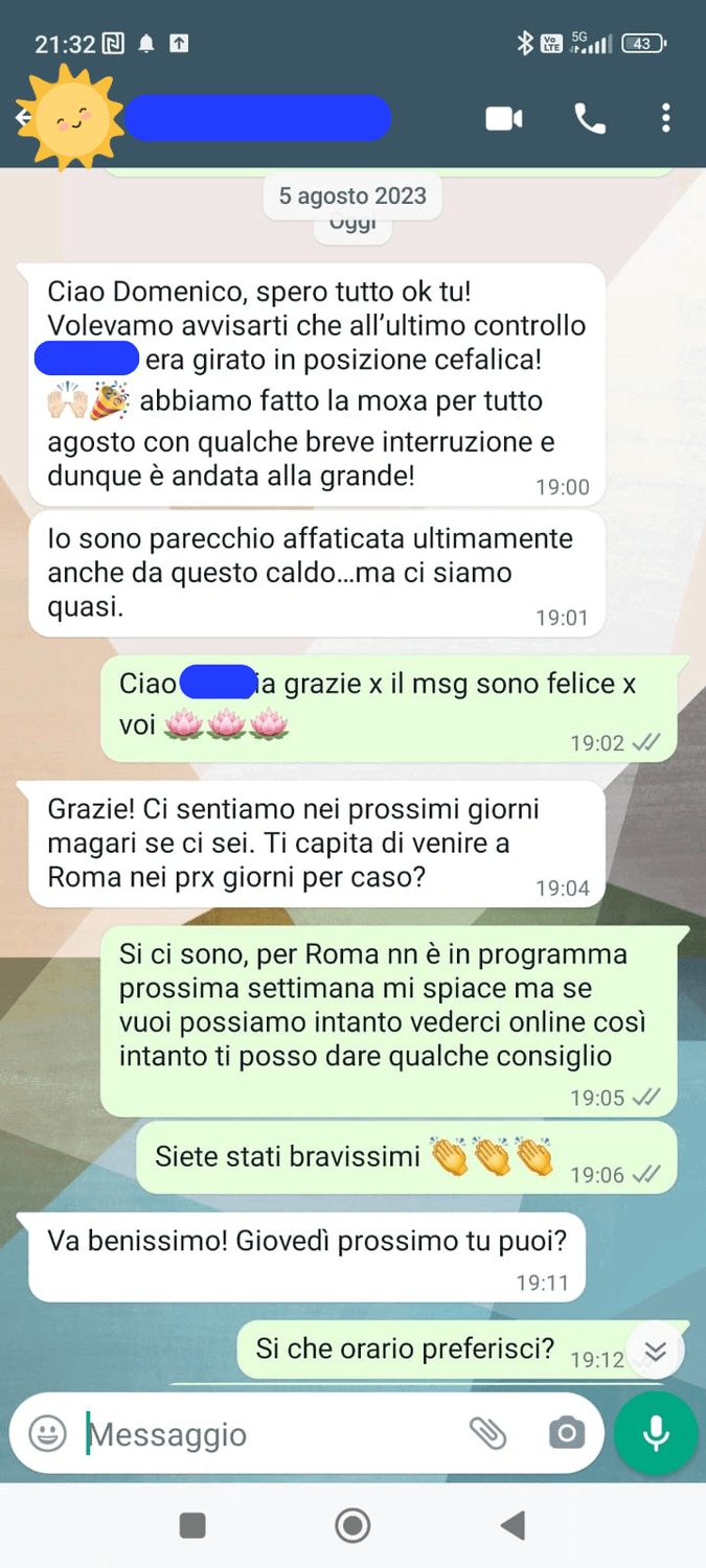 Lei riesce a coinvolgere anche il marito, vengono insieme alla seduta perchè in questi casi insegno come fare la moxa al partner. Lui è molto pragmatico, allora gli faccio un lungo discorso sulla scientificità della medicina cinese e della moxibustione.